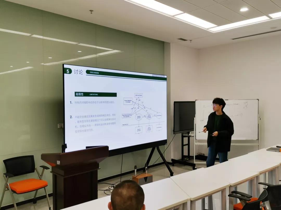 会议的主要内容是团队成员罗骁、常洢林同学分享期刊论文及自己的学习体会,老师同学们针对论文展开进一步讨论研究。罗骁同学分享选自《Personnel Psychology》的论文“Servant leadership,leader gender,and team gender role:Testing a female advantage in a cascading model of performance”,该论文主要探讨了女性领导者和团队性别角色构成对服务型领导的影响,提出了服务型领导对工作绩效的正向影响作用,并利用级联模型对假设进行了归纳概括和总结。论文结果显示:领导者性别和团队性别角色构成对服务型领导的有效性具有重要影响,在亲社会动机充分的前提下,服务型领导的追随者自身会表现出服务型领导行为,从而获得更高的工作绩效。论文的发现为角色协调理论与服务型领导理论的整合提供了有力支持,并且打破了传统的“think leader,think man”观念,显示女性在领导中的极大优势。
