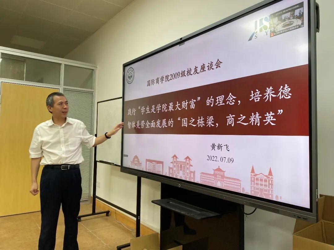 黄新飞院长向各位校友做了《践行“学生是学院最大的财富”的理念,培养德智体美劳全面发展的“国之栋梁,商之精英”》的报告。